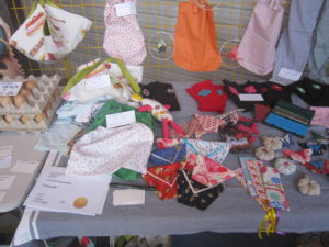 Différents modèles de sacs en tissu faits main, très pratiques pour remplacer les sacs en papier ; mitaines, porte-monnaie, peluches pour bébé, porte-clefs, broches origami, sac à tarte…