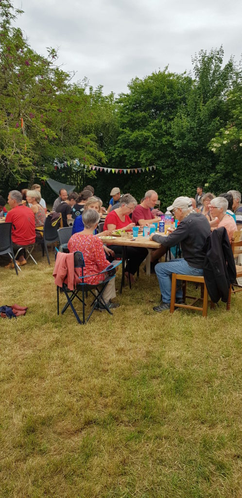 Le moment, ces deux jours, le temps d’ espace et de soleil, le lieu avec tout ce que Céline & Loïc y ont mis, y compris le chouette coin camping, la belle énergie, les rencontres, les projets qui avancent, le rire et le rire encore, les soins, la musique, des échanges, les partages, en mots, en mets, en sons, en junes, tous les êtres présents, ceux-z-et-celles qui ont installé, préparé, rangé…
