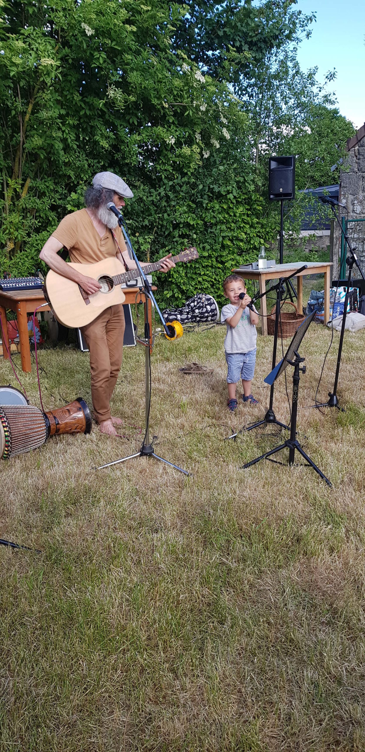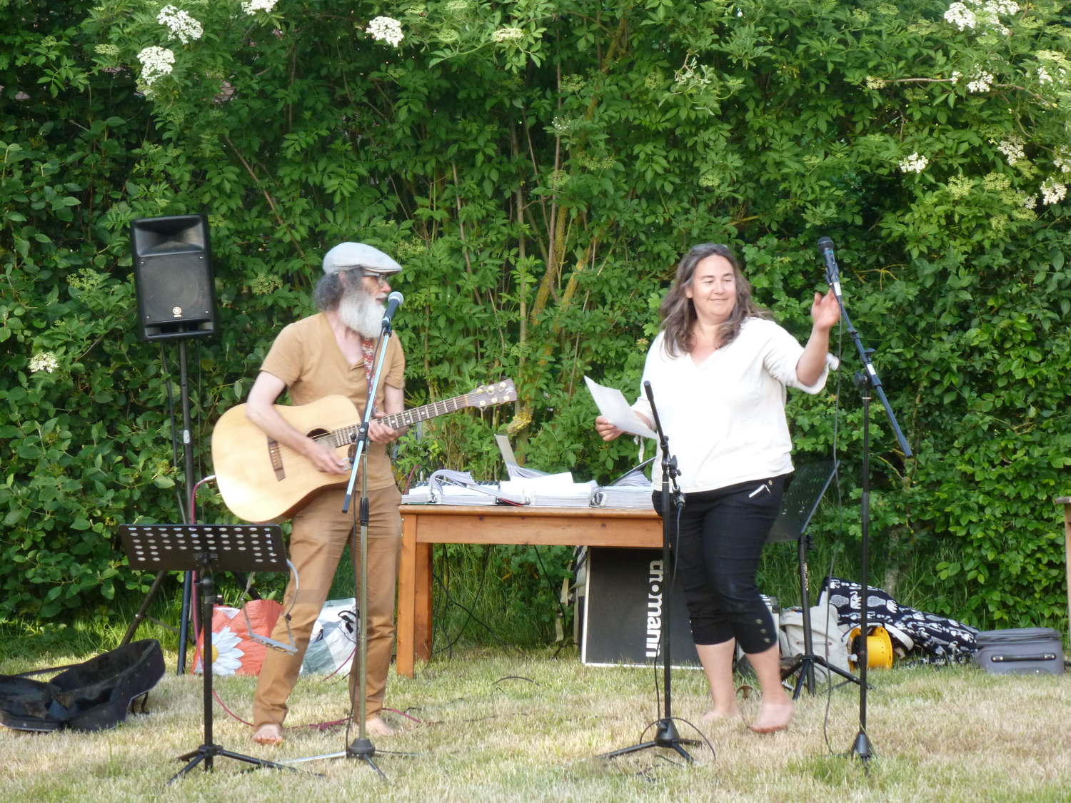 Le moment, ces deux jours, le temps d’ espace et de soleil, le lieu avec tout ce que Céline & Loïc y ont mis, y compris le chouette coin camping, la belle énergie, les rencontres, les projets qui avancent, le rire et le rire encore, les soins, la musique, des échanges, les partages, en mots, en mets, en sons, en junes, tous les êtres présents, ceux-z-et-celles qui ont installé, préparé, rangé…