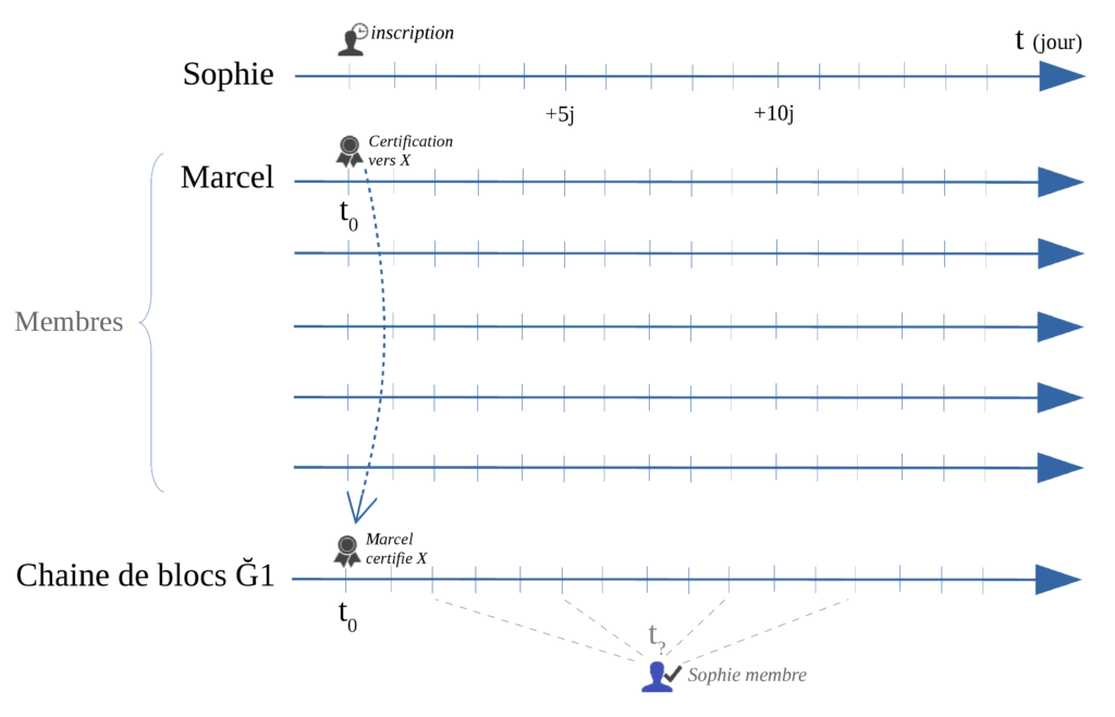 Exercice 2 : Reprendre le cas précédent, en y ajoutant que le premier membre a certifié quelqu’un d’autre (à t0) et que cette certification a été validée avant la demande d’adhésion.