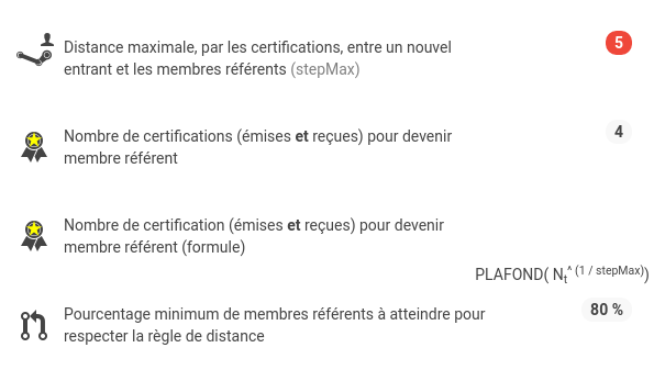 - Étudier maintenant les règles de la Toile de Confiance liées à la « distance maximale » et aux « membres référents » :